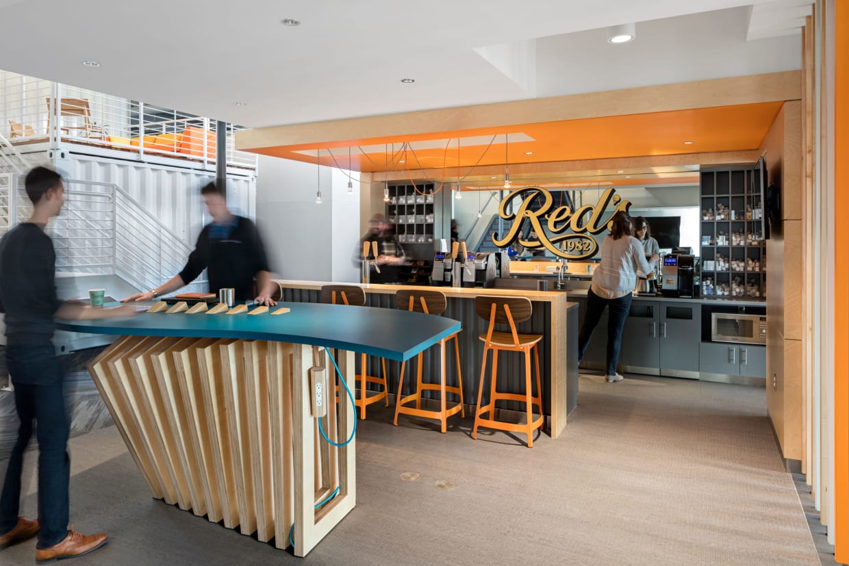 AFH was hired by Cramer to design, fabricate and install a signature table for the heart of its renovated office space. Inspired by the aperture of a camera lens fitting to the organization’s industry, the table base is made of finished baltic birch plywood, with a laminated tabletop and integrated electrical outlet.